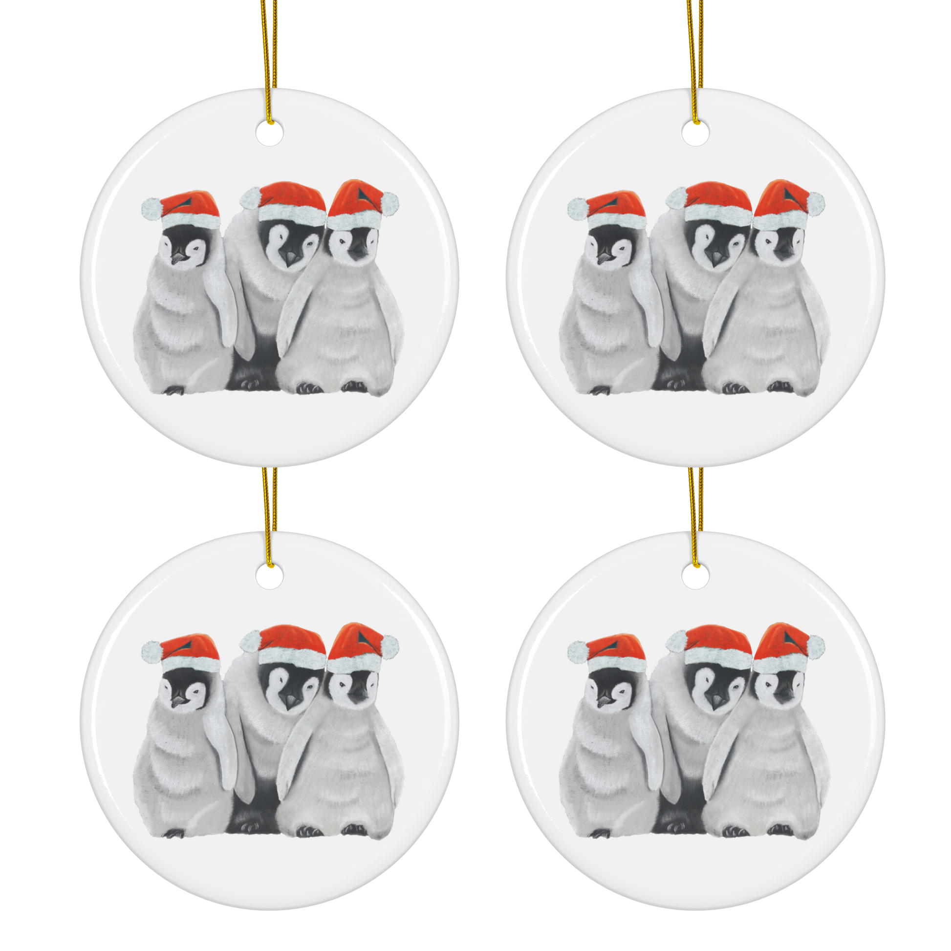 Each ornament showcases three baby penguins cuddled close, symbolizing togetherness, love, and holiday magic.